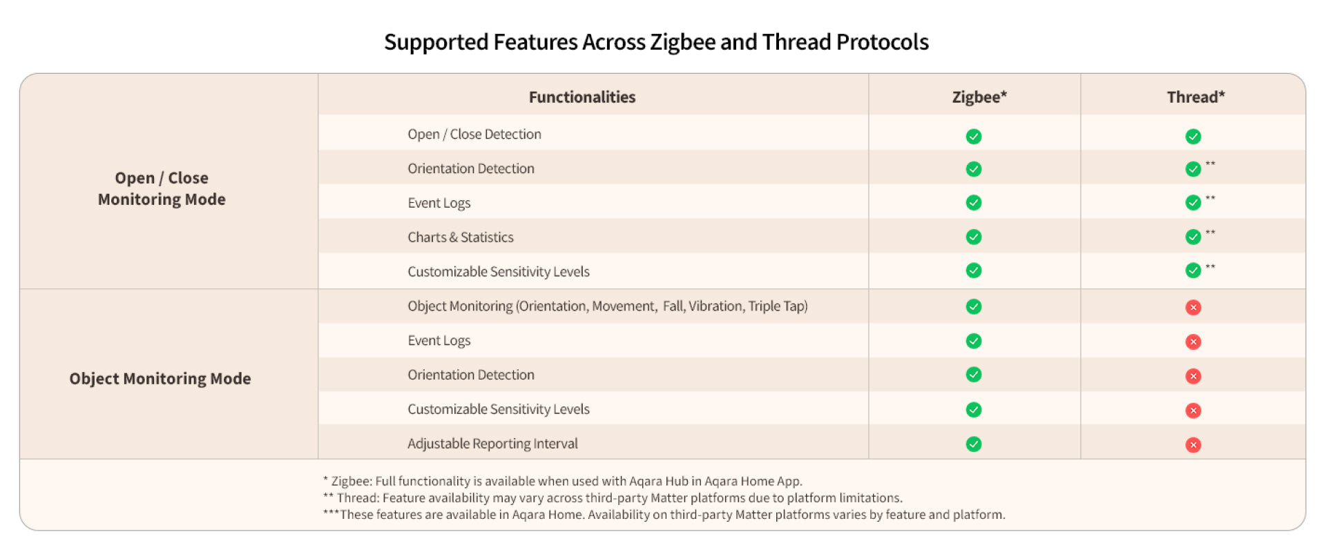 2-in-1 Sensor with Dual-Protocol Compatibility: The P100 is a versatile 2-in-1 sensor, combining door/window and object monitoring in one. It supports both Thread and Zigbee protocols with Matter compatibility to connect with Apple Home, Home Assistant, Google Home, Alexa, SmartThings, and Homey. (*Matter requires a corresponding Thread Border Router and Matter Controller). Note: Thread protocol offers only Open/Close Monitoring. Zigbee protocol (Aqara Hub required) unlocks full features including Object Monitoring. Only one mode can be active at a time.