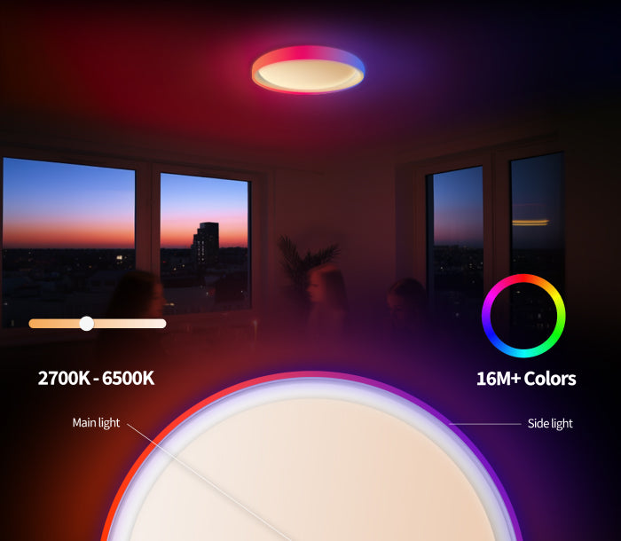 This cutting-edge ceiling light offers an extensive color spectrum. The main light spans from a cozy 2700K to a crisp 6500K, complemented by a side light featuring over 16 million colors. This versatility empowers you to customize your space's lighting, effortlessly adapting to any mood or atmosphere.