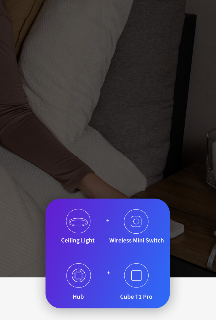 Toggle the Ceiling Light T1M seamlessly with the Aqara Wireless Mini Switch, streamlining on/off automation.