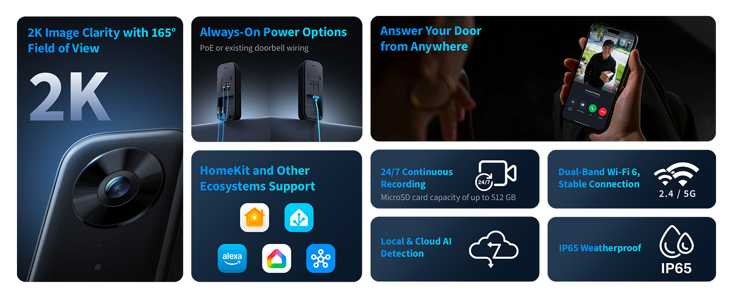 Reliable Hardwired Power & Stable Wi-Fi 6: You can utilize the high-efficiency PoE connection or reuse your existing 8–24V AC/DC wiring, simplifying the upgrade path while maintaining stability. Additionally, the Wi-Fi video doorbell supports both 2.4GHz and 5GHz Wi-Fi 6 and meets WPA3 security standards for reliable and secure connections. *Note: Does not work with your existing traditional chime.